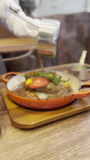 メインは、 1日10食限定の近江牛 ハンバーグを注文。 目の前で、グツグツいっている熱々のデミグラスソースをかけてくださいます。
