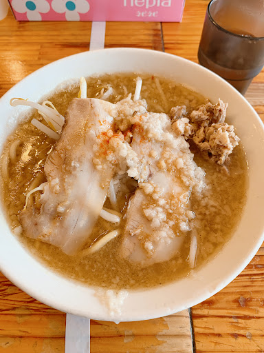 Read more同僚から煮干しラーメンならココ!と聞いて来店。 ラーメン屋は数知れず通ってますが、二郎系と呼ばれる店は初めてでした。 券売機で食券を買うのは他の店と共通ですが、麺の量は券売機で選びます。 初めて行くラーメン店ではいつもメニューの一番最初にあるのを頼んでいるので麺がチョイ多めの「にぼ一郎半」を選択。普通〜大盛りのサイズになるそうです。 タレ、野菜、脂はそれに合わせてちょい増しで注文。 出てきたラーメンを見て思ったのは確かに量が多いなと、てっぺんにトッピングされた煮干しがインパクトある。