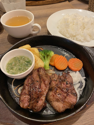 Read more接客は親切でした。ただ制服のシャツの袖を折っておられたので、折った袖の先(ボタンの近く)が配膳の時に私のスープカップに擦れていました。あと数ミリでスープにつかりそうだなと思って見ていたのですが、ベージュ色のシャツの袖の先は色が濃くなっていたので、きっと違うスープや何かに接触して汚れているんだなと思いました。袖のボタンは留めて、折るのは辞めた方が衛生的だと思います。子供の食事中に「袖が食事に付くよ!」と注意している光景を思い出しました。 国産牛ステーキを注文したのですが、メニューの写真のお肉とは全く違いました。メニューの国産牛ステーキの写真はきめ細かなサシが入っていましたが、実際のお肉はナイフで全然切れず、中は真っ赤でレアに近い焼き上がりでした。(ミディアムの焼きで注文したのに。)生肉の様で、鉄板の余熱で焼かないと気持ち悪くて食べれないと思ったので、先に全て1口大に切り、余熱で中に火が通るように工夫していただきました。3種類あるたれはどれも美味しかった...