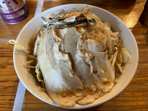 Read more同僚から煮干しラーメンならココ!と聞いて来店。 ラーメン屋は数知れず通ってますが、二郎系と呼ばれる店は初めてでした。 券売機で食券を買うのは他の店と共通ですが、麺の量は券売機で選びます。 初めて行くラーメン店ではいつもメニューの一番最初にあるのを頼んでいるので麺がチョイ多めの「にぼ一郎半」を選択。普通〜大盛りのサイズになるそうです。 タレ、野菜、脂はそれに合わせてちょい増しで注文。 出てきたラーメンを見て思ったのは確かに量が多いなと、てっぺんにトッピングされた煮干しがインパクトある。