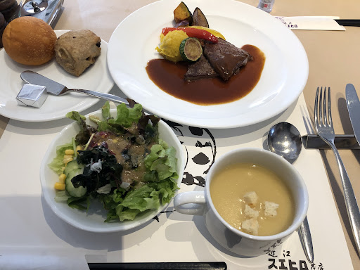 Read moreランチで利用しました。 国道1号線沿いの角地にあり、草津駅からもそれほど遠くはありませんが、車で行くのが便利な立地です。 建物の外観はそれほど目立たないかんじですが、中に入るとレストランは天井も高くて、窓外にはちょっと庭木も見えるようにしてあり、雰囲気はいい感じです。少しばかり姿勢をよくしたくなる感じです。 今回はレディースステーキのセットを注文しました。サラダやスープ、食後の温かい飲み物などはビュッフェ形式で各自とりにいきます。また、パンをチョイスすると数種のパンを次々ともってこられます。今回いただいた中では紅茶入りのパンが焼き立てでふかふかとして美味しかったです。 メインのステーキは綺麗な盛り付けでとても柔らかく美味しくいただきました。 お客さんは家族連れが多く、小さいお子さんもいましたが、概して静かで落ち着いて食事をすることができました。 とてもよかったので、また是非ランチだけでなく夜でも使いたいと思います。 また、今回は一階席の利用でしたが、二階席も利用してみたいですね。 入り口付近ではテイクアウトのお弁当も扱いがあり、同行者が買っていました(またお...