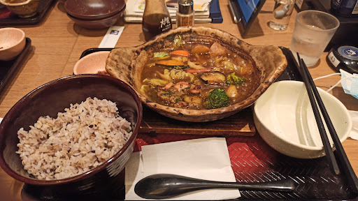 I ordered 8 kinds of vegetables curry. The taste was delicious and thickness comes from the curry. Ordering method is through a tablet with English...