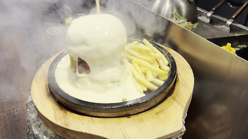 Lava Cheese Burger (溶岩 de チーズバーガー) - 1,980円 溶岩のように大量のチーズが溶け出る、熱々の鉄板をまとったバーガー