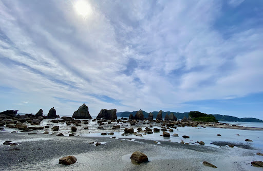 Hashikui-iwa Rocks Stretching some 850 m from Kushimoto towards Oshima Island are found about 40 odd-looking rock formations. The name, literally meaning “bridge pilings”, comes from the way these rocks look like the pilings of a bridge that links Kushimoto with Oshima Island. There is also a legend that ciaims Kobodaishi, the monk who founded Koyasan, built this natural marvel, its slihouette at sunrise is truly a sight...