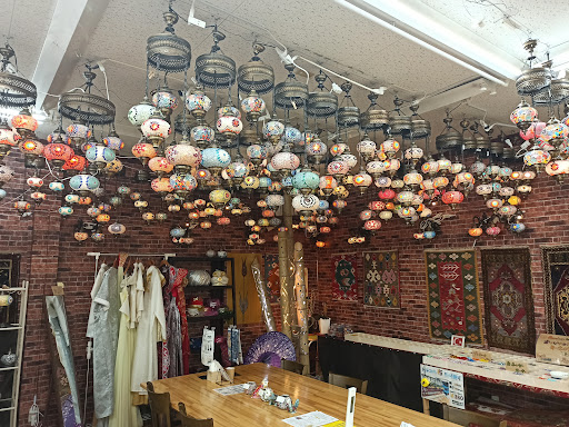 The setting is unique—part bookshop, part Turkish bazaar. On one side, shelves of books give it a quiet, almost library-like atmosphere; on the other, colorful Turkish lamps, accessories, and small crafts are on display. It’s an unusual but charming blend that feels both calm and exotic.
