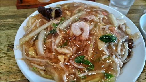 Read more口コミが良かったので、あんかけ焼きそばを食べに訪問。映えを狙って大盛り(750円)を注文しました。太目のストレート麺は、油通しはしているようですが、炒めた感じではありません。五目餡は薄めの味付けで、あまり深みがなく、途中でたんだん食べ飽きてしまい、酢とカラシで味変して食べきりました。低料金で頑張っている店主の気概は推察されますが、自分の好みの...