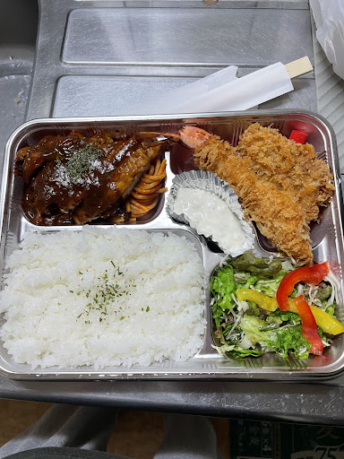 ポークチャップセット 肉柔らかく、エビフライのエビがしっかりサクサク、ヒレカツも柔らかサクサク。 タルタルソースもついて、オーロラソースは小さい醤油入れで別添え。 ご飯は大盛り無料で店内食ならおかわりも無料 サラダのドレッシングは、ほんのりスモーキーで美味しい。