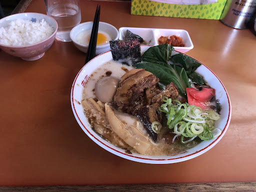 霧色ラーメンは、白濁した臭みのないマイルドな豚骨スープ。麺は黄色くなく小麦を感じるタイプの中細麺。角煮は肉がほろほろで口の中で脂が溶けます。 スライスされた紅生姜をかじりつつ食べる。煮たまごは意外としっかり火が通ったゆで卵でした。とても久しぶりに食べたけど、変わらない味で懐かしく思う。