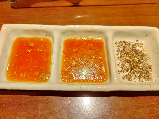 安くもないけどそれほど高いわけでもなく。人気店のようで、土曜に電話したら20時までは予約でいっぱい、20時半から空き次第とのこと。 結局20時過ぎに入ったが、一部売り切れあり。牛タンにネギは乗っていなく、欲しければ別途注文。醤油ダレ、味噌ダレ、胡椒、岩塩、コチュジャン、ニンニクあり。