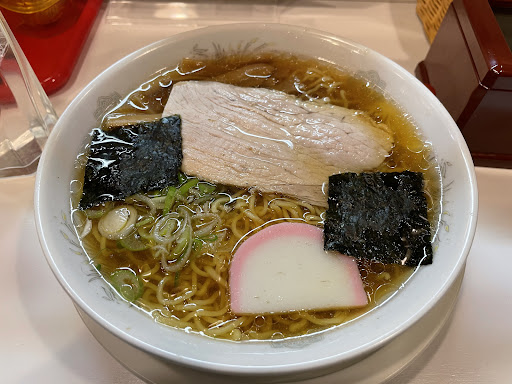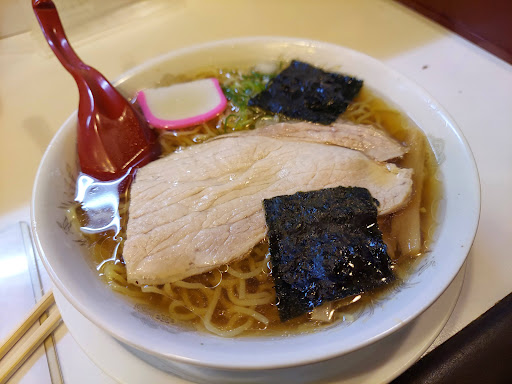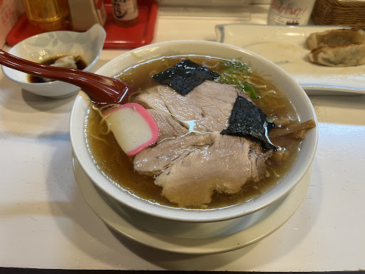 そして餃子を半分ほどいただいた後ラーメンが着丼。 スープはどこか懐かしいあっさり系の味。 最初はちょっと薄いかな?と思いながら食べ進め、先程の餃子の味が和らいでいくと、隠れていた旨みがスープを口にするたびに顔を覗かせてきます。麺は好みの細麺で、焼豚はもも肉を使っていてとってもジューシー。 店内の雰囲気も相まって、昔のラーメンってこうだったよなぁとノスタルジーに浸れるお店でした。
