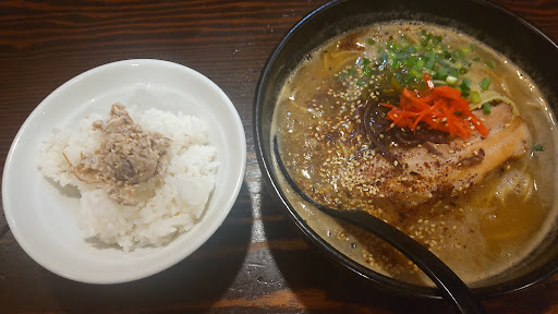 とんこつラーメンが売りなお店。 食券スタイル。 チャーシューはトロトロ系で、お箸で強く持つと崩れそうな柔らかさ。味も◎ 麺は九州系とんこつラーメンらしく硬めのストレート麺。メニューによってはちぢれ麺もあるみたい。 替え玉は150円。食券買わなくても替え玉は現金で店員さんへ途中注文してもいいシステムらしい。 浅めの比較的小さな丼で来たので、値段の割にちょっと少ないタイプなのかなと思ったが、意外と麺がたっぷり入っていてボリュームあった。 とんこつ塩がこの店のメインのようなので今回はとんこつ塩に決定。 濃厚でコクがあり、高菜や紅しょうがや白ごまもタレを引き立てている。 好みが別れるところなので、これは完全に個人的な感想だが、白ごまやスープの出汁に使用しているだろう粉末感が、少しだけ舌や口腔内に触り、気になる。ぐびぐびタレを飲んだら噎せそうな気がする。若者にはいいと思うけどお年寄りにはあまりオススメ出来ないかも。 サイドメニューの明太ご飯も食べて来たけど、辛すぎるのが苦手な私にとってはちょうどいい辛さ。量も丁度いい。マヨネーズも店員さんが置くかどうか聞いてくれるのでお好みでかける。明太がマヨネーズとよく合ってなかなか美味しい。海苔も2枚ついてくるけど、物凄く肉厚でしっかりした海苔なので、歯応えのある海苔が好きな人には堪らないかも。 噛む力の弱い人は一気に食べずに手でちぎるかスープに浸すのをオススメする。噛む力が弱い人は噛みきれずに海苔が詰まりそう。スープを吸った海苔は最強に美味しかった。 店内は清潔でオシャレな内装。遅い時間に行った為か、程よく空いていて店員さんも感じのいい接客をしてくれ、店内は居心地が良かった。 紅しょうがや水は調味料と同じくセルフ。最初に紅しょうがは少し入っているけれど、足りなければ自由に足せる。 カウンター席は6~7席、ボックス席は3テーブルで全て小上がり。 必要時には荷物置きを店員さんが出してくれる。 難点は駐車場が少ないかな。5台前後入ったらもう路駐かどこかに停めて歩くしかない。大きい道路を挟むからウロウロ駐車場を探したりしにくいと言う点も有るかな。大きい通り沿いにあるから直ぐに見つけやすいのはとても良いのだけど。 総合的な感想を言うと、お年寄りにはちょっと不向きに感じた店かな。 ま...