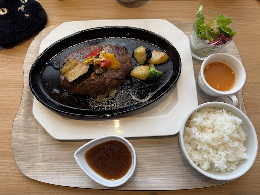 I opted for the burger steak with grilled vegetables, and it was simply excellent! The patty was thick, juicy, and bursting with flavor, accompanied by colorful vegetables and a delectable dipping sauce. My companion chose the pork steak in a tomato-based sauce, which was tender, rich, and cooked to perfection. Both dishes arrived hot and were beautifully presented.