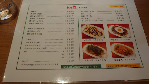 Read moreどちらかと言うと、価格面と味で私の評価は低い想夫恋ですが、ここ玖珠店はマズマズです。まず価格とメニュー内容が総本店とは違っていました、わずかですがお安いです。移転して数年になる店舗はまだ新しく手入れも行き届いています。また、本命の焼きそばが旨い。作り手の腕か?もやしの量が多く感じ、シャキシャキ感も良い。味も総本店より薄めで程良い。少しだけ想夫恋を見直しました。