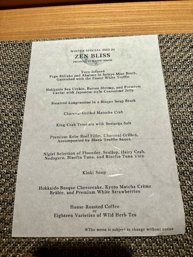 My husband and I really wanted to love this restaurant, however, as the previous poor reviews mentioned, our Zen Bliss experience at ¥100,000 per person, was a big letdown. The prestigious white truffles promised on the menu prior to our reservations were replaced with the less expensive black truffles. The coveted nodoguro fish, also printed on the menu the night of our dinner, was not provided. There were tiny bits of shell in our matsuba crab dish as well. The overall quality and taste of the dishes did not impress and seemed average to other fine dining establishments at less than half the cost.