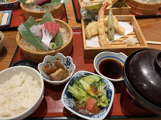 Read more平日ランチ11時オープンと同時で予約を事前に取っていきました。11時ジャストに到着しましたが駐車場はけっこういっぱいになりつつあるところで予約していって正解でした。 入ると下駄箱に靴を入れてカギは自分で持って入るシステム。お座敷、テーブル席、掘りごたつ席があり私たちはお会計すぐ横の掘りごたつ席に案内されました。注文は自分の携帯で注文するシステム。案内してくれた方が分からなければ呼んでくださいね〜といった感じだったので最悪分からない人は店員さん呼んで注文もOKなようです。 注文を待つ間、パッと近くのカウンターを見てみたら何か動くモノがあると思ったらGでした。。おしぼりの入ってるBoxの下に入ったり出たりしていて虫嫌いな私はちょっと恐怖でした。Boxの下が掃除されていない感がかなりあったのでお掃除していただけるといいなと思いました。 注文後15分ちょっとでお料理が運ばれてきました。マルサ定食を注文しましたがとても美味しかったです。 白ごはんの量は最初に選べますし、あら汁もとても大きいお椀でドンッと出てきます! お刺身も数種類が桶に乗ってきますが下に氷が敷いてあるので食べ終わるまでひんやり食べられるのが嬉しかった。てんぷらは、エビ1尾オクラさつまいも玉ねぎ白身魚どれも温かく美味しかった。あったかい天つゆにおろしを入れて食べる感じです。 あと大根と厚揚げの煮たものがあって味が染みていて美味しかった。サラダも少し付いてましたがドレッシングの味が少し濃かった気がします。 でもどれも美味しかったし連れが食べていたのもとても美味しかったと言ってました。 また両親を連れて食べに来たいと思います。 それまでに清掃だ...