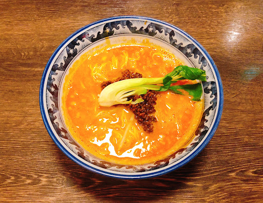 【ドラゴン担々麺】 食欲をそそる真っ赤な麺顔が美しいですが、 辛さは控えめでかなり食べやすいです。 ゴマの味が前面に出たタイプでもないので、 クリーミーなコクと辛さのバランスも良いです。 麺が細めでスープとよく絡みますし、 ひき肉にも味噌の味がよく染みていました。