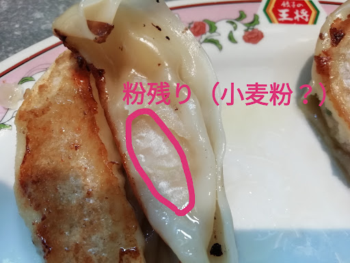リニューアル後は、焼く機械が変わったのか、焼く人が変わったのか、ずっとアタリ続きでした・・。(^^) ところが今日は久々のハズレでした。(なので投稿しました) まるで水餃子を焼いたような感じで、皮がベチャベチャでヌルッとしてました。また、隣り合う餃子の間には粉(小麦粉?)が残ったままで粉っぽい食感があり、とても残念な餃子でした・・・。