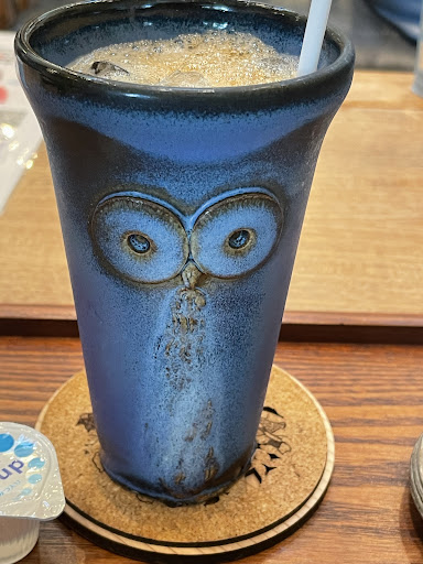 Read moreフクロウへの愛と店内の調度品、食器などこだわりを感じました。入場料等はなく、通常の喫茶店価格でのドリンク提供で有難いです。プレッツェル絶品でした! 斎場と隣接しての喫茶店だからか、本当に静かにゆっくり癒されながらフクロウたちを眺めることができました。 店内のメンフクロウさんは優しく触れることは出来ます。フクロウたちのお部屋にも入室可能でした。ストレスにならないようにされている気遣いも感じられました。 遠方からお邪魔しましたが、いけるなら何度も行ってみたい!そんな素敵な喫茶店でした✨✨ 店員さんも優しく対応してくださり、イケメン店員さんもいらっしゃいました(笑) アップルジュースのコップのフ...