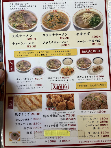 アイドルタイムの15時頃訪問するも客は6割くらい入っておりそこそこ忙しい状態。 カウンター席へ通され、天風ラーメン+唐揚げごはんセットを注文。