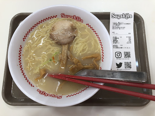 東海地区のショッピングモールのフードコート等に出店されている超有名ラーメンチェーンです。 一度も食べたことがなかったので、三重県に訪れた機会に訪問しました。 こちらの店舗は桑名市にあるイオンモール桑名の中にあるお店ですが、フードコートではなく仕切られた店舗になっていて、2階の正面入り口すぐのところにあります。 ファーストフード的なレイアウトで席を確保してカウンターで注文する方式なんですね。メニューにソフトクリームなどのデザートが充実しているのも特徴的です。 全体的に安い価格帯で基本的には和風とんこつ味で、みそラーメンもあり、麺大盛とトッピングやセットメニューが選べます。 週末に訪れましたが夜8時過ぎていたので、お客さんはまばらでした。「濃い味スガキヤラーメン」を注文しました。 呼び出しブザーを渡してもらいカウンターに取りに行く方式です。 トンコツラーメンは好きなのですが、かなり変わったスープなんですね。まずは普通のスガキヤラーメンを食べてみるべきでしたね。 面白い特徴的なラーメンフォークも見られて良かったです。