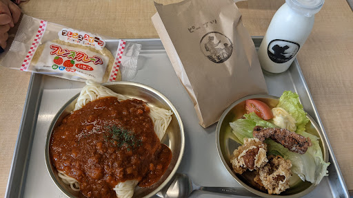 ハンバーガーが主に売っていますが金次郎給食もあります!🍔 私は金次郎給食を食べましたがハンバーガーも食べたかったなぁ‥‥ 金次郎給食は揚げパン(きなこ、シュガー、ピーナツから選べます)、鯨の竜田揚げ1個と鶏の唐揚げ2個、サラダ、ミートソースソフト麺、クレープアイス、牛乳です!揚げパンは揚げたて熱々で油がじわっとでて美味しかったです。唐揚げカリッカリ🐋🐔、ソフト麺は初めて食べましたが美味しい!クレープアイスは小中学生の頃たまに給食で出たので懐かしい味でした。 瓶牛乳初めて飲みましたがパックより美味しかったかもですw瓶の絵柄も可愛い!🐮📖 個人的に揚げパンはピーナツを選びましたがこれがめちゃめちゃ美味しかったのでおすすめです!🥜でも、きなことシュガーも食べたいなぁ〜 量は少ないので足りないと思います。でも、給食の気分を味わえるので楽しいです。 給食を食べていた小中学生の頃に、...