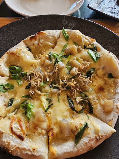 本番のピザが良い感じで焼き色付いて出てきました。白みそピザの上にはコンニャク、じゃこにチーズがのっていました。食べてみると、…白みそはご飯と一緒に食べよーと思いました。なんでここまで来てドウの上にじゃこをのせて食べないと行けないんだろうと思いながら落ちたじゃこをお箸で拾って食べました。 それから、たまごのビスマルク…写真に出てる具を見て、想像できる味です。まず、ピザなのに手に持つことが出来ない‼️ガックン‼️ 写真にものせましたが、具が全部落ちてしまい、フォークで食べました。まず、ピザになってない😢ドウが固くて…噛んでも噛んでも口の中に最後までコロコロ残ってて…嫌でした。 味はお家のピザって感じ…なのにこの値段?⤵️
