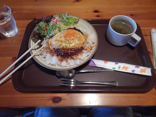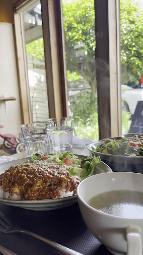 Read more近所にご飯屋さんがないかググるとハンバーグ定食が出てきたのでいざ入店。 店内は広々だが席数は少な目、コロナ対策? ゆったりくつろげそうなオサレな店内でした。 メニューみるとロコモコがあったので注文。 待ってる間にハンバーグが焼ける音と匂いがいい感じに食欲をそそる。 まあゆうてハンバーグやし、そこそこの味やろって思いながら食うと、めちゃくちゃ柔らかくてジューシーな肉汁肉質が口の中いっぱいに広がり非常に旨味がある。適度に脂もあり、京丹波とかドライブがてらとかそんな条件関係なしに普通にうまい! 田舎の里山周辺の気取ったカフェなんやろとか思ってたら本格的ながっつりハンバーグ。 国道沿いの人目付きやすい沿線なら行列できてるクオリティ。 京丹波きて山菜?栗?黒豆?京都肉? あえてこじゃれたハンバーグ選んでもありなレベル。 カフェもメニュー見る限りうまそうやった、今度試してみよ。