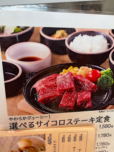 Read moreサイコロステーキのメニューとかなりの違いが激しいです。どこら辺がやわらくジューシーなのか?スジが多く固いしか思いません。 久々に引くレベルでした。平気でコレを調理し飾り付けし提供する極太神経のお持ちのスタッフには圧巻です。まさに美人局! 企業として客を馬鹿にしているとしか思えない。 写真盛りすぎですよ。これで1580円です。 メニューと違いコーンもありません。表示されてるものもありません。 メニューとあまりにも違いがある場合、ひと口も食べなければキャンセル可能なので、食せずそのままキャンセルが良いかと。 返しのコメントして頂いたようですが、あいも変わらず改善もせずこんな程度の低いステーキと呼べない肉を提供するとは恥を知れ! 改善する気もないのにコメント必要なし。 企業姿勢が本当によくわかる。 景品...