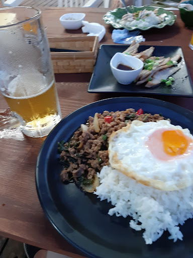 訪問時は、「カオマンガイ」「グリーンカレー」「トムヤムクン」を注文。 どれも味は本番のタイ料理を感じさせる一品で、日本人向けなのか、そこまでクセもなく食べやすかったです。 トムヤムクンについては、入れ忘れなのか具材がエビ4尾とシメジだけだったので、パクチーだったり他の具材が入っていていてもいいのかな〜とは思いました。 近くの海水浴場からこの立地、眺めなどを考えるととても良いお店です。 ガッツリというよりかは一皿をシェアする食べ方の方が向いているかもです。 他のコメントにもありますが、ビールはキンキンに冷えてる感じがして美味しそうでした。