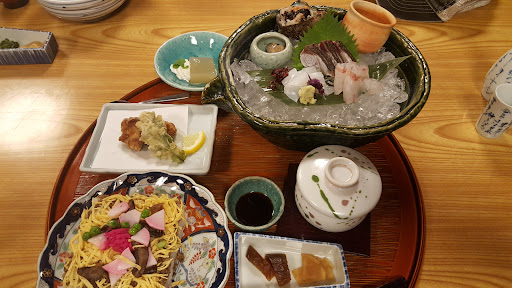 I went to Torimatsu because of their local specialty, "barazushi," a lasagna looking dish made with layered rice and topped with shiitake mushrooms, peas, shredded egg, kamaboko, pickled ginger, and grilled then sauteed with soy sauce and crumbled on top. I ordered the Tango set meal, which included really fresh sashimi (and some of the best wasabi I have had here), fish-stock soup, fish tempura, pickled vegetables, and dessert. This was an incredibly large lunch for 2,100 yen. The menu is actually quite large, and they have the entire menu in English and Chinese (as well as Japanese, of course). I heard that the restaurant is also quite well-known for their udon, but no one I was with ordered that today. The restaurant also has a variety of locally caught fish, local vegetables, and other ingredients. There is a second floor for larger parties, and I quite liked the traditional décor in the restaurant. We ate in the corner on Japanese-style tatami mats, but there were also tables. While my lunch was more than I would normally pay for lunch, the value was incredible because of the amount of excellent food I was served. But the restaurant also offers other satisfying set meals for under 1,000 yen. One of the people I was with ordered the local, fried chicken set menu, which also...