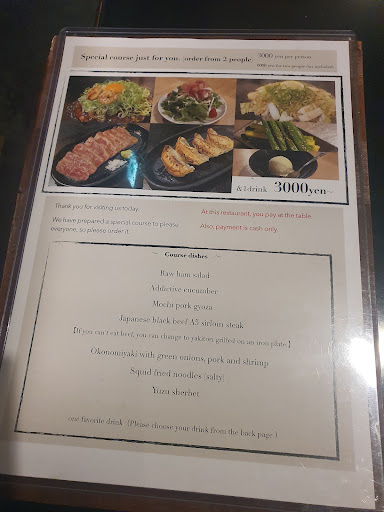 Read moreWe ate here in the evening (around 8:30pm) and the staff were incredibly warm and welcoming. We had the suggested dinner set which was ¥3000 per person. The dinner set menu was in English, but their regular menu is not. The dinner set was multiple courses and included salad, seasoned cucumbers, sliced steak, gyoza, and green onion/pork okonomiyaki and yuzu sherbet. Highly suggest this set, everything was delicious!