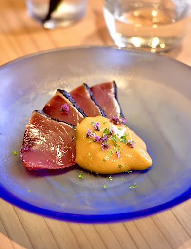 1品目【かつお塩〆熟成卵黄醤油】 なんと!美しいのが届きます!✨ てっきりチョイ飲みセット的な盛り合わせが届くと思ってたら、1品ずつ、器に盛られてきます✨ しんなりと横たわるビーナスのような鰹に、 ぬんめりとしたエスプーマのようなふわふわ卵黄が 濃く、しかししょっぱくなく、カツオの塩加減とのバランス絶妙! 鰹の皮はまだ少しパリッとしてて、まるでフレンチを食べてるよう。