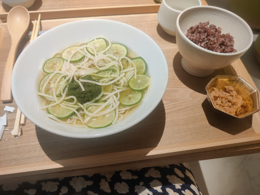 Stumbled upon this gem while wandering the alleyways of Kyoto. The staff didn't speak a lot of English, but with google translate and their enormous hospitality and friendliness we figured it out. Ordering is through a simple terminal, which unfortunately doesn't accept the new yen bills just yet. However, they do accept most European credit cards so paying was no problem at all. Keep in mind that you are asked to order one dessert or drink with your meal. Given the amazing flavours of their meals, see this as a treat rather than as a penalty! For lunch we had a noodle set with lime, lime suji sorbet, rice and minced chicken as a main dish. The cold noodles were extremely welcome on a hot summer day. The lime flavours paired nicely with the saltiness of what I believe was a dashi stock. The rice and chicken were nicely paired with the noodles which arguably was the main star. For dessert we had a little simple flavour gelato mix. This comes with two teas, one to be drunk before and one after. The three gelato flavours are not what you normally expect from gelato but they definitely know what they're doing!! My favourite was the rooibos gelato with the juice. Great way to cool down and energize yourself for the rest of the day. Finally, the atmosphere is an inviting modern look with a central kitchen and a small garden that attracts pollinators such as the old world swallowtail. If you're ever in the area, I would 100% recommend this cute...