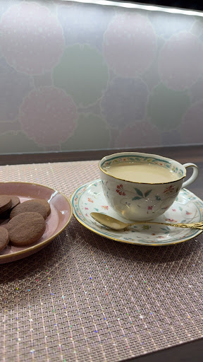 さっきのシフォンケーキや、別で頼んだ紅茶を並べたら、まるでアフタヌーンティーやーん🥺✨ カトラリーもピンクやしぃ〜🌸 グラスの方は、バニラアイスとポン菓子。 この時期は 【桜のポン菓子】になっていて、薄いピンクがとっても可愛い🩷 お口に春がきた!🌸