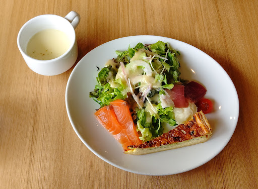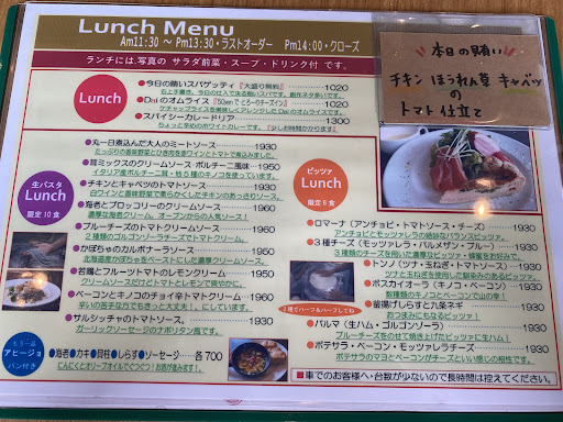 Read more近くだし気になってたけどなかなか行けなくて、でも口コミみたら美味しそうだなぁ🤍🫧って勇気をだしてひとりでランチに行ってみました♪ お店の中は明るくておしゃれな感じでシェフの作られた可愛い木のお人形が飾ってあります。(ここで人間国宝さんのステッカー発見!) スタッフの方も可愛らしくて感じの良い方ばかり♡ まだ開店して間もない時間なのにお客さんがたくさんで常連の方も多いみたいでした。 エビ好きのわたしはエビとブロッコリーのクリームパスタをオーダー♪ わくわくしながらお料理をまってると、まず前菜登場! 見た目にも素敵でお味も…う〜美味しい! キッシュはふんわり卵の優しい風味✨️そして自家製ドレッシングがとっても美味しくて買って帰りたくなりました✨️ そして待ちに待った生パスタ!! 一口食べてなにこれ!って美味しすぎてひとりで目を見開きながら食べてしまいました😳 もちもちぷちぷちの生パスタに絡む濃厚なクリームとしっかり味がする新鮮でぷりぷりなエビ! 食べてる間にも誰かに伝えたくなってしまって友だちと今度一緒に来ようと約束♪ クリームソースがたっぷりなのでめっちゃパンがほしかった〜! でもスプーンですくってぜんぶいただきました♡ デザートはたべないつもりだったけど可愛いスタッフさんのおすすめで抹茶のチーズケーキを追加でお願いしてしまいました☺️ こちらも甘すぎなくてとっても美味しかったです♡ お誕生日の方がいらっしゃったようで店内にハッピーバースデーの曲が流れてケーキにロウソクをたててもらってました🎂 なんとなくこちらまで幸せな気持ちになりました♡ 今回はお昼でしたが夜だとお誕生日にはシェフ手作りのプレゼントがいただけるそうですよ♪ こんな素敵なお店を近くにみつけてしあわせです!自分へのご褒美に何度も通いたいお店になりました✨✨ 美味しかった〜...