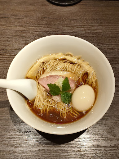 鴨と大山鶏を使用した風味豊かで旨味のきいた清湯スープに、全粒粉使用のモチモチ麺が美しく盛り付けられた一杯が楽しめる人気ラーメン店