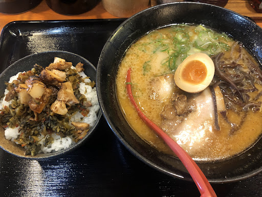 高菜ご飯はタップリの高菜にチャーシューの脂の部分が混ざっている。脂が溶けていたので少し炙ったりしてるのだろう。仄かな甘さと脂の旨味。