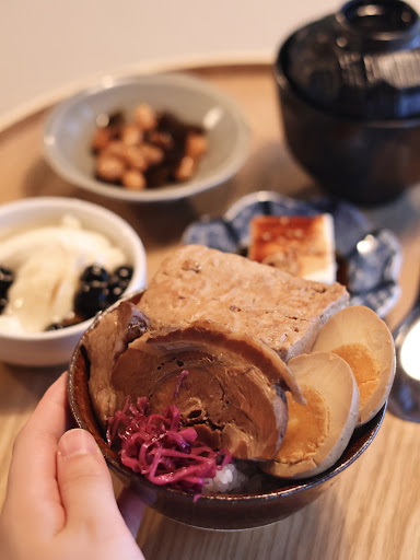 豆腐焼豚丼には大きくてぶっ厚い木綿豆腐! 焼豚も味玉も染み染みでヘルシーなのに、 ボリューミーで満足感がすごいっ!!✨