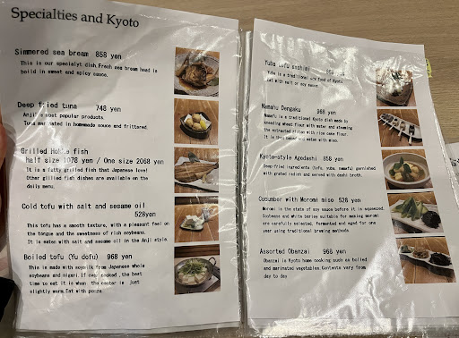 Anji is a seafood-focused izakaya with a menu of small plates and grilled seafood great for sharing and pairing with drinks! Ordering was streamlined and done via QR code, and the service was attentive and on point. We started with the Obanzai plate, which came with three local vegetable dishes including radish, eggplant, and mushrooms/carrots/scallions. We also had two other Kyoto specialties: boiled tofu, a pot of soft tofu cubes with Napa cabbage and other vegetables cooked on a hot plate at the table; and Namahu Dengaku, or skewers of chewy baked wheat gluten topped with miso sauce.