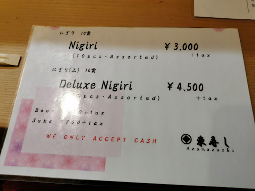 Read moreAzuma Zushi is a small sushi house hidden in a quiet neighborhood in Higashiyama, Kyoto. The family-owned restaurant only has 9 counter seats, making it rather cozy. They only accept cash. Guests who would like to make a reservation must be able to communicate in Japanese. The a la carte menu is only available in Japanese, and most items do not have a fixed price. Sushi variety is reasonable, and the quality is OK. Highlight of the lunch is the freshest fatty tuna sushi. Don't waste money on the...