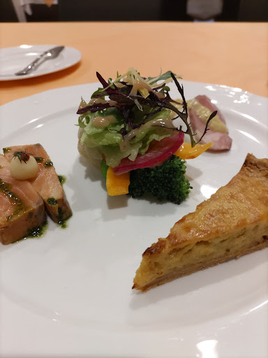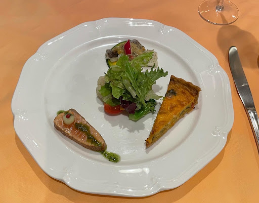 前菜は自家製スモークハム、サーモンのくすんだ香り、ハーブのきいたソース、キッシュの玉ねぎの甘みが印象的でした。