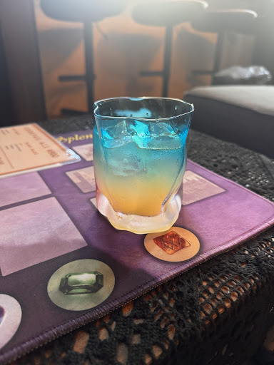 Alongside drinks, they serve comforting food, like Japanese-style curry smothered in gooey cheese. The cheese blended perfectly with the curry’s rich, spicy flavors—a must-try! I enjoyed a refreshing iced tea with fresh fruit, while my husband had a gin cocktail; the adorable bear-shaped ice in mine was a fun touch.