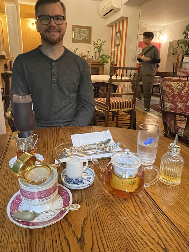 Read moreThis place is a little hidden gem in a seemingly quiet neighborhood. Walk down a few stairs into a basement cafe filled with floral patterns, antique furniture, and dainty dish-ware. I had the meat pie and scones with a pot of Earl Gray tea while my husband had the pancakes with iced coffee. My meat pie had a perfectly flaky crust and the meat filling was so delicious. The scones with tea took me back to my prior trip to Oxford. I had one regular scone and one earl gray variation. My preference was the classic scone. The clotted cream wasn’t quite like the batch I had back in Oxford but it was light and tasty. The tea came with a dropper of apple bourbon which gave a nice twist of flavor to a classic morning beverage. My husband’s pancakes were PERFECT. They were fluffy and filling. Overall, we chose this place on a whim and what a pleasant...