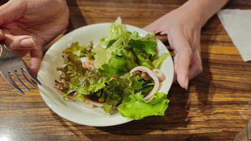 We started with a fresh, crisp salad – a welcome, light beginning that set the tone for the meal. Next came the fried calamari and mixed seafood salad, perfectly tender with a satisfying crunch, balanced by a tangy, creamy dressing. The garlic bread arrived warm and toasted, its simple but bold flavors a comforting companion to the dishes that followed.