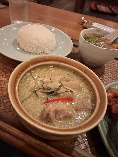 Lovely from start to finish. I came in around 20:00 on a Friday and I did not have to wait at all. The staff was super friendly and welcoming and gave me the table that I wanted to sit at. The decor was very nice, and while there were other people in the restaurant, it was still very quiet with some nice music playing, and overall a very calming atmosphere. I ordered one of the weekday dinner sets and I did not wait long. The meal came and it was absolutely delicious. The curry was not spicy, which was a bit surprising for a Thai place but they had spice on the table that I could add. It was super flavorful and every piece of the meal was delicious. I ate every bite. I also found the prices to be quite reasonable and it looked like they had a nice liquor menu although I did not get any drink this time. I look forward to my next visit. Only note is that it was cash only which I didn’t notice before I came in, but it was okay because I had some cash with me. Overall great atmosphere great staff and...