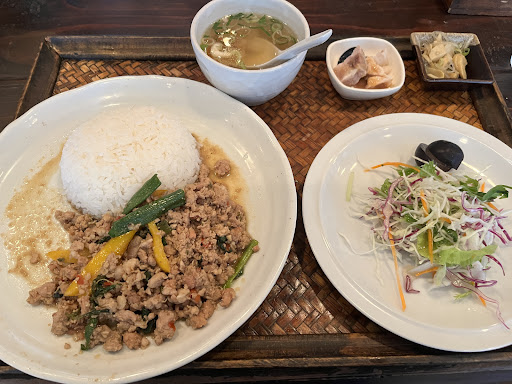 I came here because they had moo krob on their website’s menu. Inaccurate. So I had the krapao moo lunch set. It came with bell peppers (🙄) and no fried egg (🫥). No seasoned wok flavor, no spice level options. It was sweet. The side dishes it came with were forgettable. And the food took 20 mins. to arrive.
