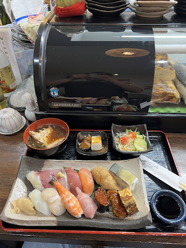 Read more先週来訪時は混んでいたようで、ラストオーダー前で仕度中…悲。再挑戦で無事にランチできました。 メニューはお寿司系と定食系とありましたが、初めてなので、お寿司のセットのにぎり12貫に鯖寿司といなり寿司を加え、税込1800円を注文。なお、水でなくアイス緑茶って言うのが良かったです。しかもダッシュしてきた私にはちょうどよい並々注がれて。しばらく待って出てきたお寿司をみると回転寿司と比べものになりません。 鯛、マグロ系、鯵、マグロ系、サーモン、烏賊、帆立、海老、トロ系、いくら、穴子、鯖鮨、いなりに副菜の赤出汁、サラダ、茄子と豆腐の田楽。まず赤出汁。魚のあら入りの赤出汁。田楽もサラダも美味しく仕上げます。サラダのドレッシングが絶妙のバランスです。そしてにぎり寿司はどれも美味しい。特にエビと帆立。エビの旨みを久しぶりに感じました。帆立も甘みがあって艶がありました。最近は回転寿司三昧だったので尚更です。あと好物の鯖鮨。食べ応えがあり追加したいぐらいです。 どれを食べてもネタとシャリのバランスも良かったです。ボリューム多いなという感じです。あと山葵がよく効いてます。昔はお寿司なんぞ高級食で中々食べる機会がなく、その頃を思い出します。やっぱりお寿司には程よく山葵を効かした方がいいと改めて感じました。なお食事後近隣の回転寿司に行き何皿か食べましたがやっぱり違うな。店主が握るお寿司はネタ選びからシャリの仕上げ方を含めさすがと感じました。 次回は定食系に挑戦したいです。やっぱり唐揚げ定食かな…差別化しにくいだけに。 夜も来てみたいで...