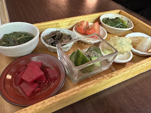 前菜 ①空芯菜生姜ひたし だしと生姜のバランスよく、空芯菜と良い相性 ②オクラとろろ昆布 ③ゴーヤ煮干しあえ ゴーヤって、料理の幅が狭いようで実はいろんな可能性あるなぁって思う一品 ④ツルムラサキ昆布浸し ⑤ナス削り節煮 ⑥きゅうりに柑橘甘酒 きゅうり自体が旨い、水分豊富 ⑦ごま豆腐干しエビ揚げ これ、美味しい〜干しエビが、いい出汁 ⑧玉ねぎじゃこ煮 甘い、じゃこは食感的アクセントになっている