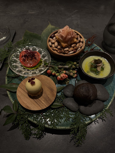 【前菜】 目の前で青いお皿に庭園を作っていく。 次々と並ぶ小皿。 ワクワクが止まらない。 最後に青く丸いプレートにズラリと並べる。 フィンガーフードが中心の前菜。 ○馬肉 ビーツ 北イタリアで食べられるドライトマトとビーツのタルタル。 甘酸っぱい‼️初恋の味‼️ ものすごくイタリアン! ○ペペロナータ 帆立 中はパプリカのプリン、鯛のおだしの泡。 んん〜ふわふわの泡に、優しいホタテ✨ パプリカに甘み感じたの初めて! ○フォアグラ 塩レモン アイスサンドクッキーになってる✨ なんて可愛いの😍 塩レモンのピューレがすっごいレモン! ひんやりしてて、あぁ〜残暑の暑さがエーゲ海の爽やかさに変わっていく!✨ ○七谷鴨ンドゥイヤ お饅頭のような真っ黒な見た目はイカ墨。 ふんわりした生地の中から鴨肉のミートボールとオリーブの実。 ○鮑 万願寺 ジュノヴェーゼ くるくると巻いてかぶりつく。 なんて柔らかい鮑✨ 野菜のうまみが負けてない!
