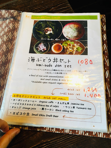 We had the Nasi lunch set, vegan, and got a generous sampling of miso soup, adzuki bean rice, curry shredded cabbage, sweet & sour eggplant , tofu and Asian greens, burdock & lotus root. There's a vegan banana tart on the menu, vegetarian taco rice, several vegetarian desserts, wine, beer, coffee, tea, Okinawa spirits and juices. The dinner menu included grilled tofu and seitan with plum and egg, along with a big selection of meat based Okinawan dishes.